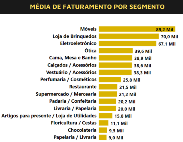 Entre os 16 segmentos pesquisados com maior relevância para o período de promoções, o de móveis, brinquedos e eletrônicos são os que têm o maior ticket médio. Na sequência vêm óticas; cama, mesa e banho; calçados; e vestuários.