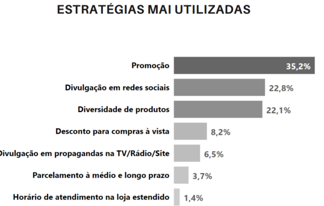 A maioria dos lojistas (70%) declarou que vai utilizar alguma estratégia para aumentar as vendas na Black Friday de 2023. Dentre elas, a “promoção” foi a mais mencionada, com 35,2%, seguida pela “divulgação em redes sociais” (22,8%) e pela “diversidade de produtos” (22,1%).