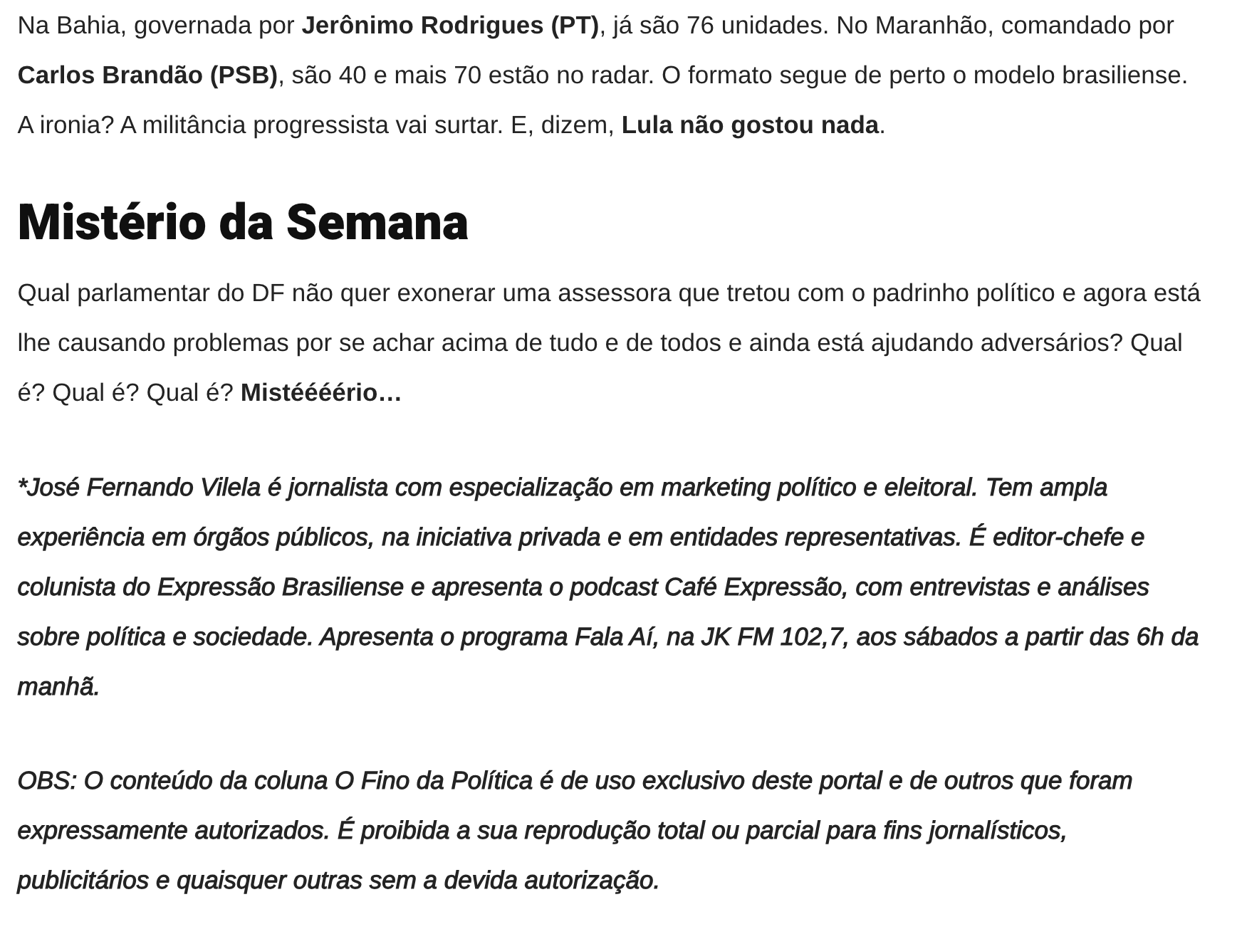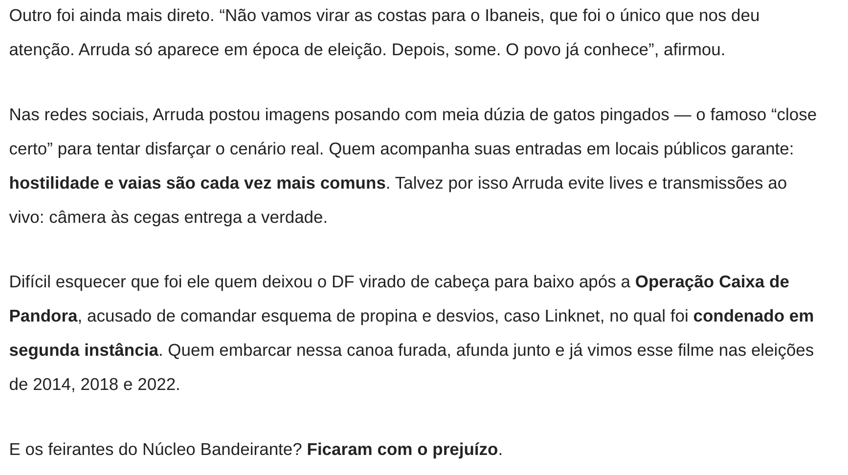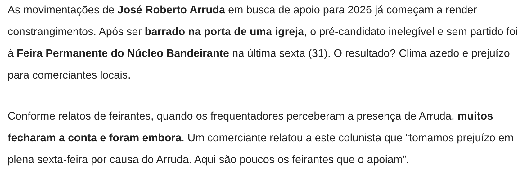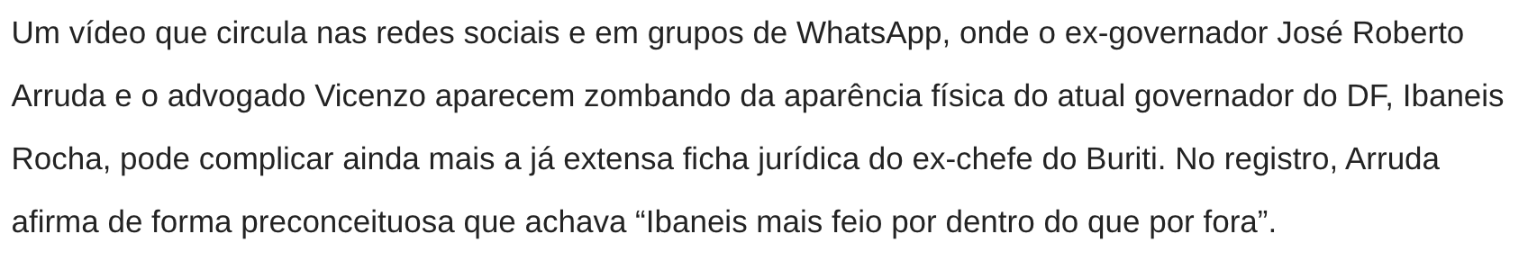 José Fernando Vilella Arruda e advogado podem responder por crime eleitoral por zombarem da aparência de Ibaneis Rocha 4 de novembro de 2025 COMPARTILHAR AGORA FacebookXPinterestWhatsApp Mais emJosé Fernando Vilella Michelle e Bia insistem em chapa puro sangue ao Senado... Encontro entre Vorcaro e Lula no Planalto desmonta discurso da... Cármen Lúcia deve decidir sobre mudança da Lei da Ficha... Articulação de alianças e nominatas vão dominar a pauta do... Kassab e ala do PT nacional articulam chapa Arruda-Grass ao... Bia Kicis vira a casaca, trai Michelle e declara apoio... COMPARTILHAR AGORA FacebookXPinterestWhatsApp Últimas Notícias 500 famílias do Arapoanga recebem escrituras de... Iluminação em LED chega a quase 97%... PMDF devolve segurança e autonomia a mulheres... Nova frota: Distrito Federal se prepara para... Zoológico terá entrada gratuita neste sábado somente... Carro da Vacina passa por área rural...