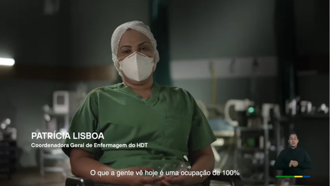 A campanha tem o objetivo de mostrar a realidade de quem trabalha de forma árdua desde o início da pandemia para salvar vidas. Por isso, traz o depoimento da coordenadora geral de enfermagem do Hospital de Doenças Tropicais (HDT), Patrícia Lisboa. “O que a gente vê é uma ocupação de 100% dos leitos de UTI. E por mais que você abra 30 leitos, vai continuar sem, se as pessoas não tiverem consciência”, alerta.