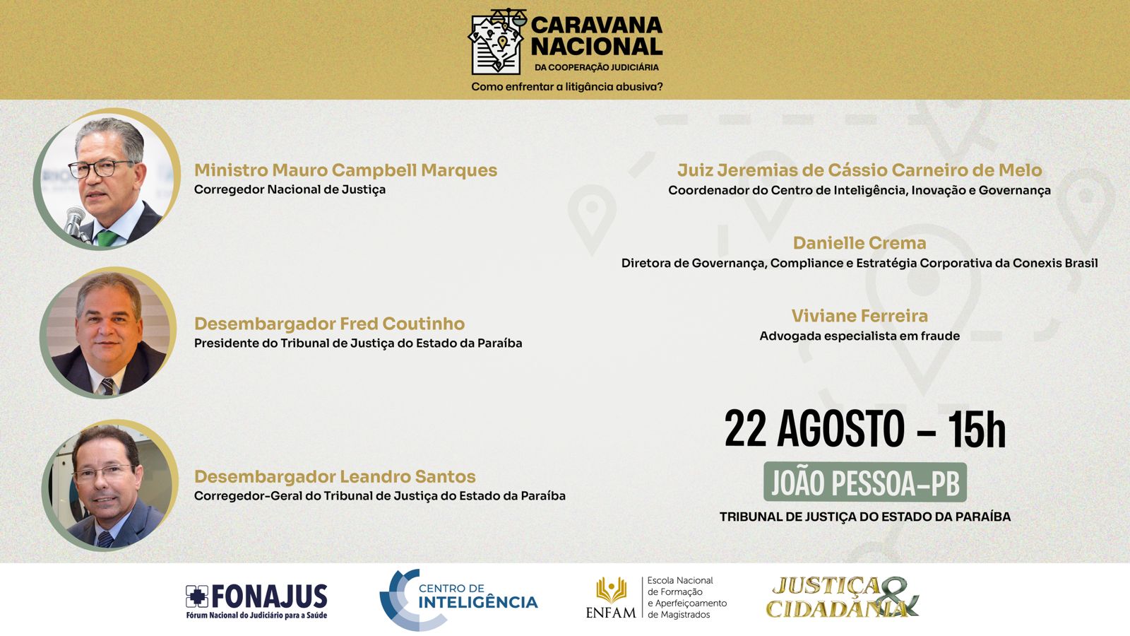 O evento contará com a presença de autoridades como o corregedor nacional de Justiça, ministro Mauro Campbell Marques; o presidente do Tribunal de Justiça do Estado da Paraíba, desembargador Fred Coutinho; o corregedor-geral do Tribunal de Justiça do Estado da Paraíba, desembargador Leandro Santos; o coordenador do Centro de Inteligência, Inovação e Governança do TJPB, juiz de Direito Jeremias de Cássio Carneiro de Melo; a diretora de governança, compliance e estratégia corporativa da Conexis Brasil, Danielle Crema; e a advogada especialista em fraudes, Viviane Ferreira.