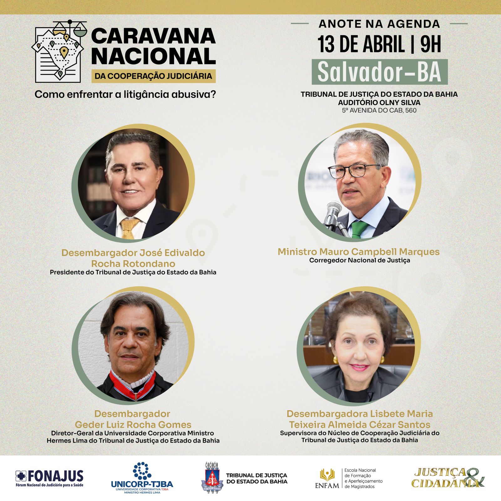 O evento contará com a participação, entre outras autoridades, do corregedor nacional de Justiça, ministro Mauro Campbell Marques; do presidente do TJBA, desembargador José Edivaldo Rocha Rotondano; do diretor-geral da Universidade Corporativa Ministro Hermes Lima (Unicorp-TJBA), desembargador Geder Luiz Rocha Gomes; da supervisora do Núcleo de Cooperação Judiciária do TJBA, desembargadora Lisbete Teixeira; da supervisora do Fórum Nacional do Judiciário para a Saúde (Fonajus) do Conselho Nacional de Justiça (CNJ), conselheira Daiane Nogueira de Lira; e da juíza auxiliar da Vice-Presidência do Superior Tribunal de Justiça (STJ), Daniela Madeira, sendo as duas últimas coordenadoras acadêmicas da Caravana. O Fonajus e a Escola Nacional de Formação e Aperfeiçoamento de Magistrados (Enfam) são apoiadoras do projeto.