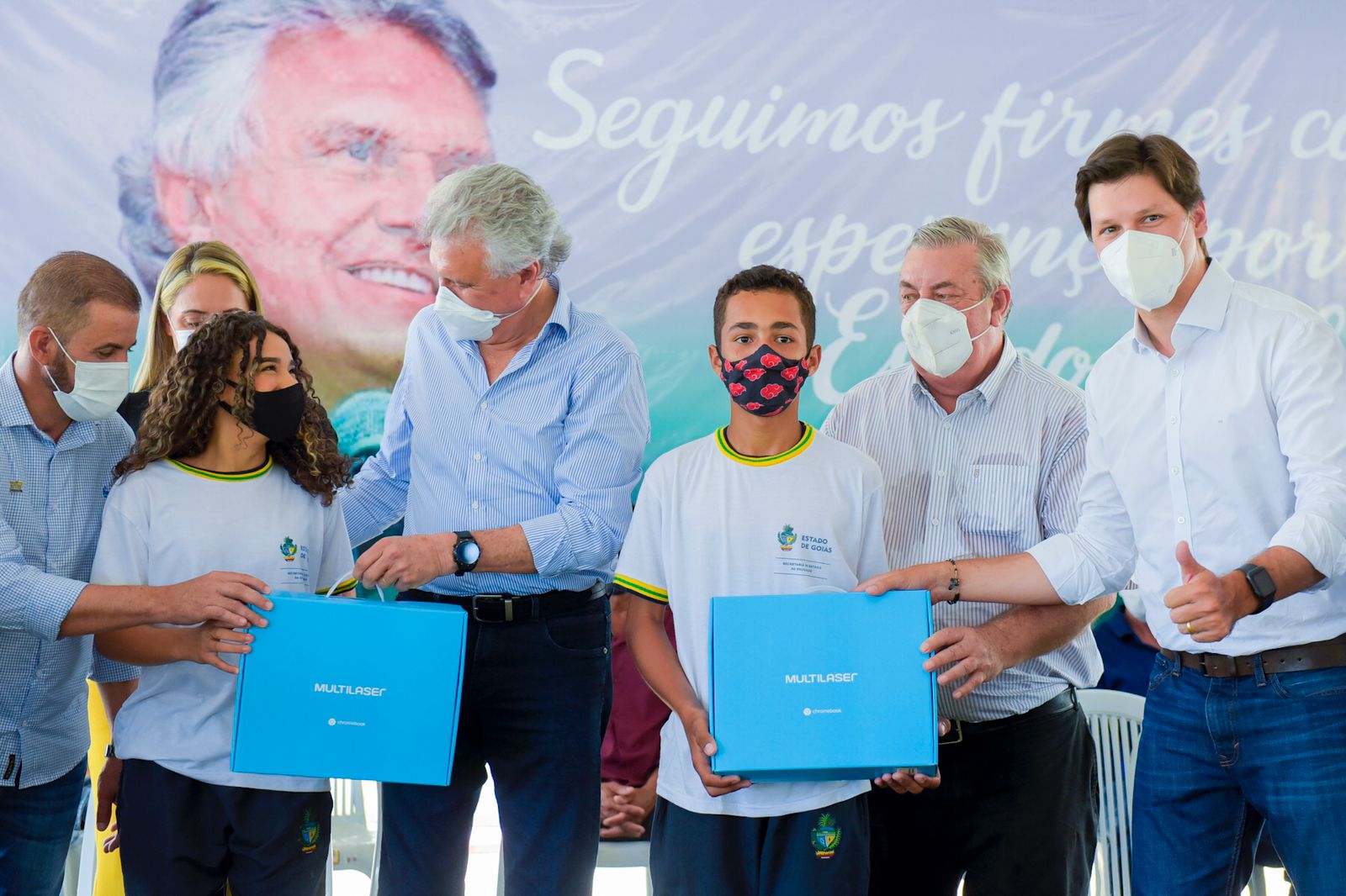 O governador Ronaldo Caiado lançou, nesta segunda-feira (18/10), o Programa Goiás em Movimento – Eixo Municípios em Uirapuru e Nova Crixás, na região Norte. Nos dois municípios, o governo estadual, por meio da Agência Goiana de Infraestrutura e Transportes (Goinfra), investiu mais de R$ 2,5 milhões na recuperação de 84.250 metros quadrados de asfalto de ruas e avenidas. Ele também entregou 200 Chromebooks a alunos do terceiro ano do Ensino Médio da rede estadual de ensino.
