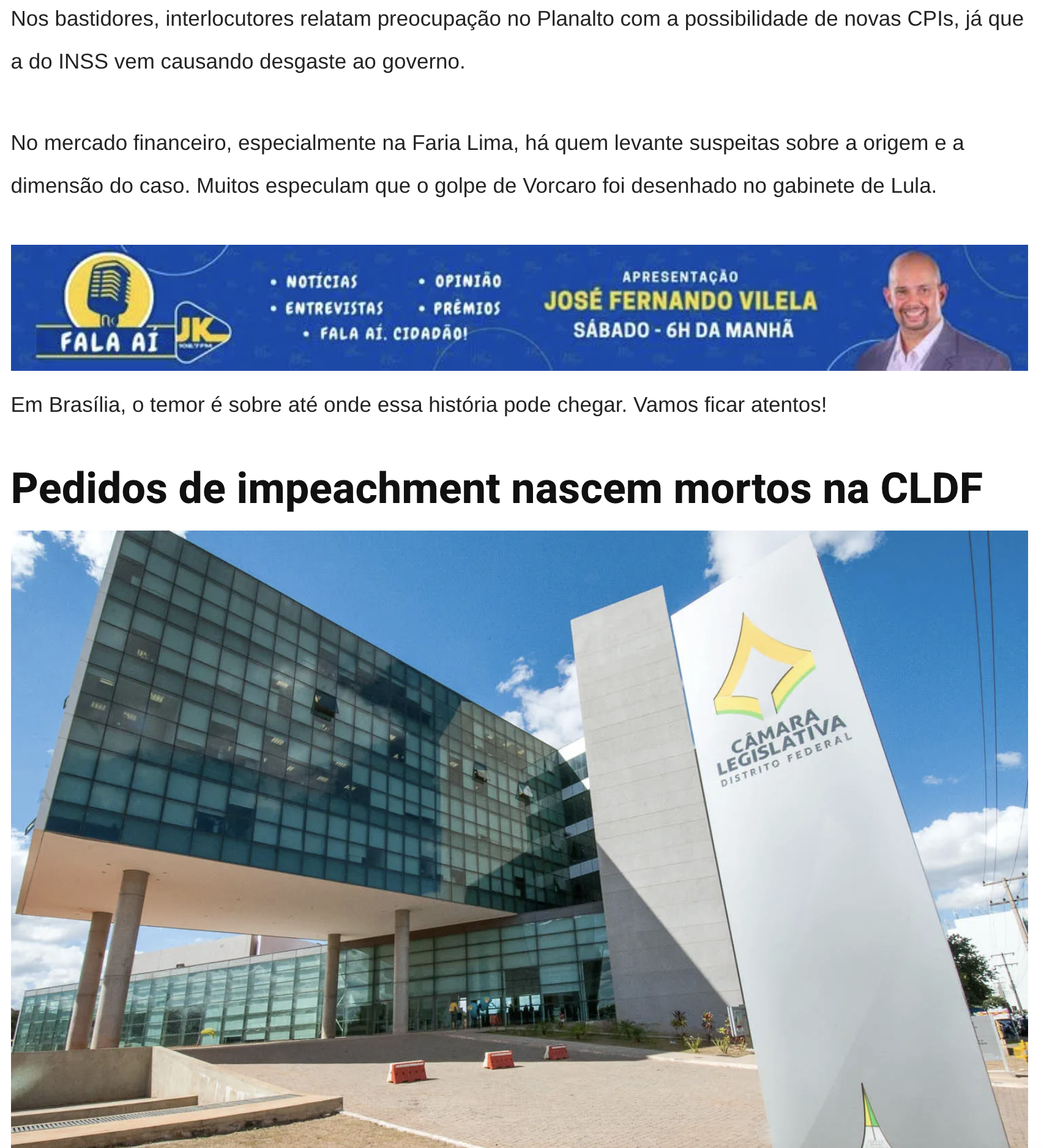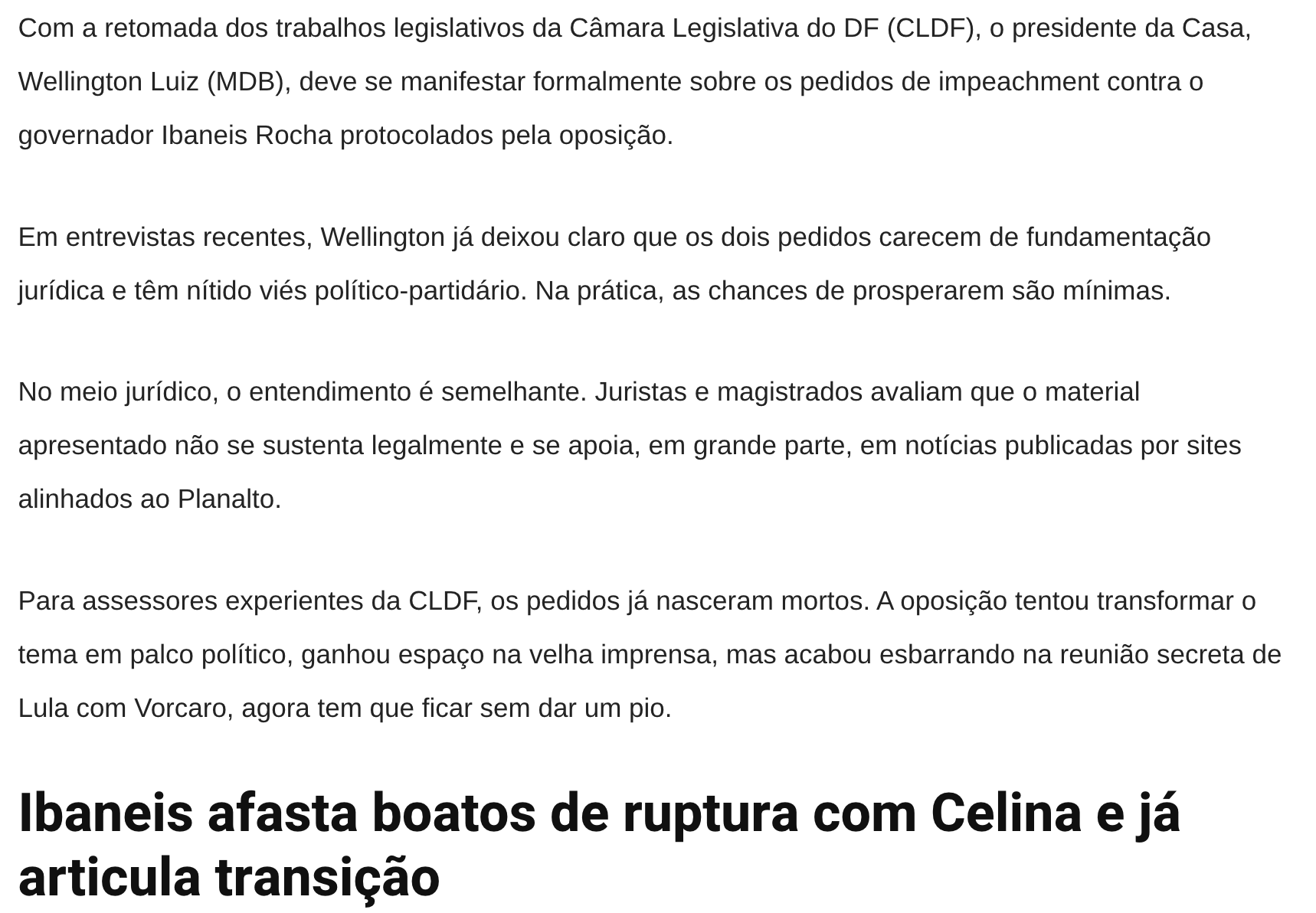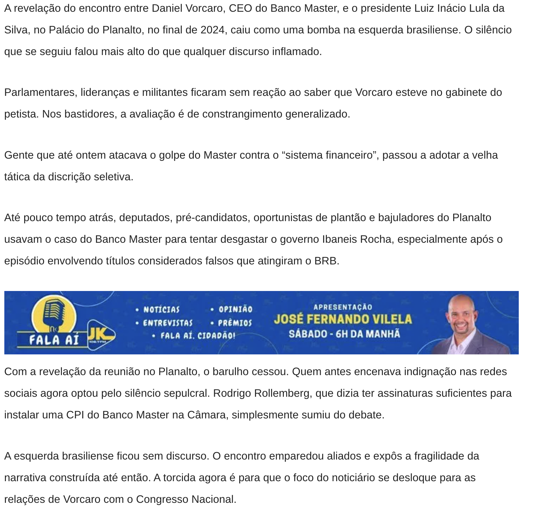José Fernando Vilella Encontro entre Vorcaro e Lula no Planalto desmonta discurso da esquerda brasiliense 6 de fevereiro de 2026 COMPARTILHAR AGORA FacebookXPinterestWhatsApp Mais emJosé Fernando Vilella Michelle e Bia insistem em chapa puro sangue ao Senado... Cármen Lúcia deve decidir sobre mudança da Lei da Ficha... Articulação de alianças e nominatas vão dominar a pauta do... Kassab e ala do PT nacional articulam chapa Arruda-Grass ao... Bia Kicis vira a casaca, trai Michelle e declara apoio... Prisão de Bolsonaro acirra o clima de disputa eleitoral ... COMPARTILHAR AGORA FacebookXPinterestWhatsApp Últimas Notícias 500 famílias do Arapoanga recebem escrituras de... Iluminação em LED chega a quase 97%... PMDF devolve segurança e autonomia a mulheres... Nova frota: Distrito Federal se prepara para... Zoológico terá entrada gratuita neste sábado somente... Carro da Vacina passa por área rural...
