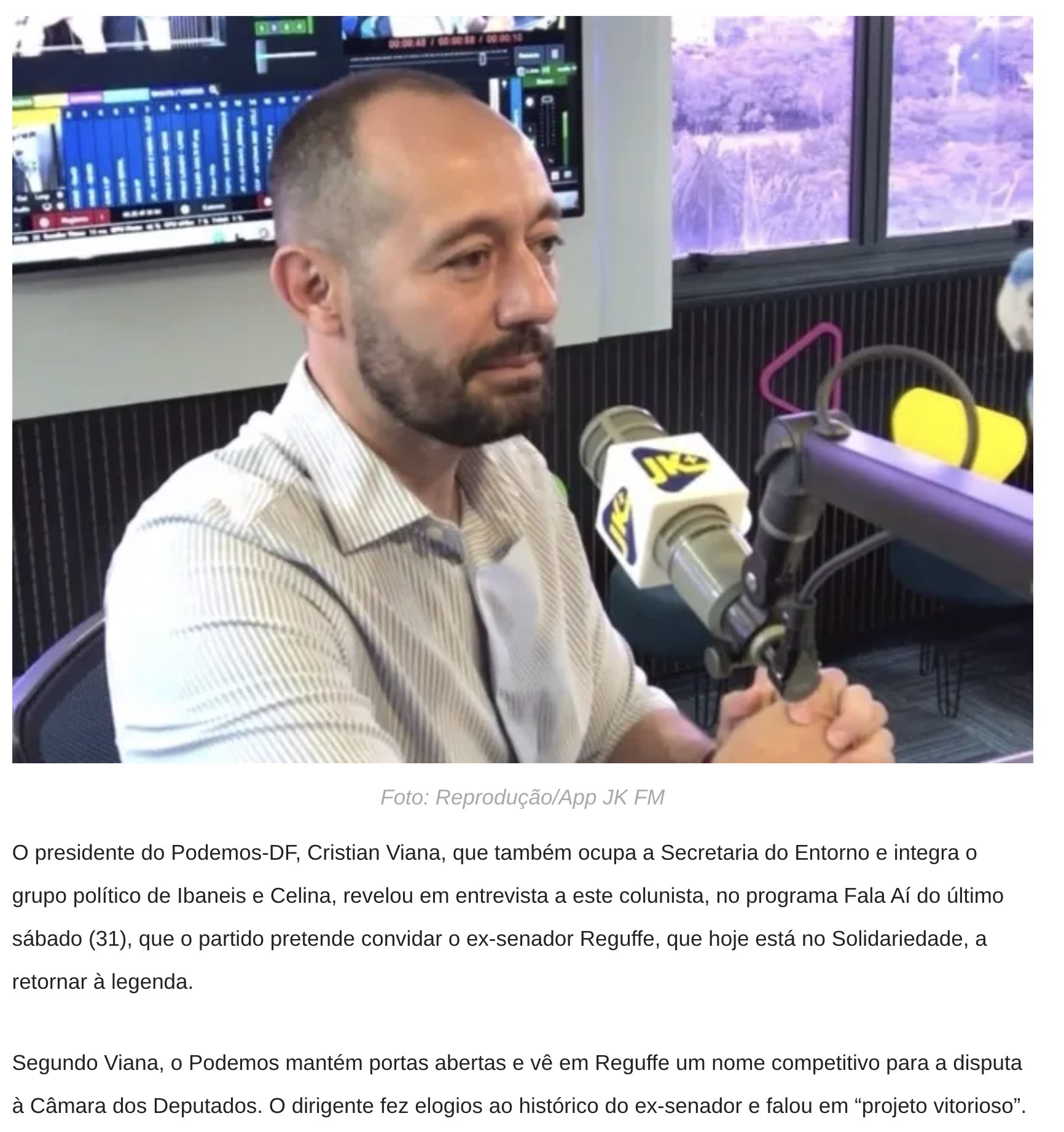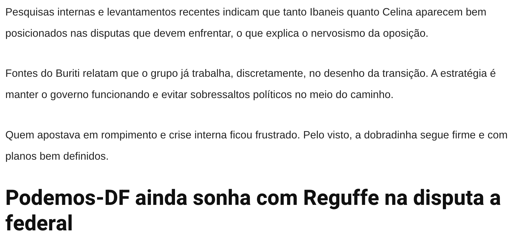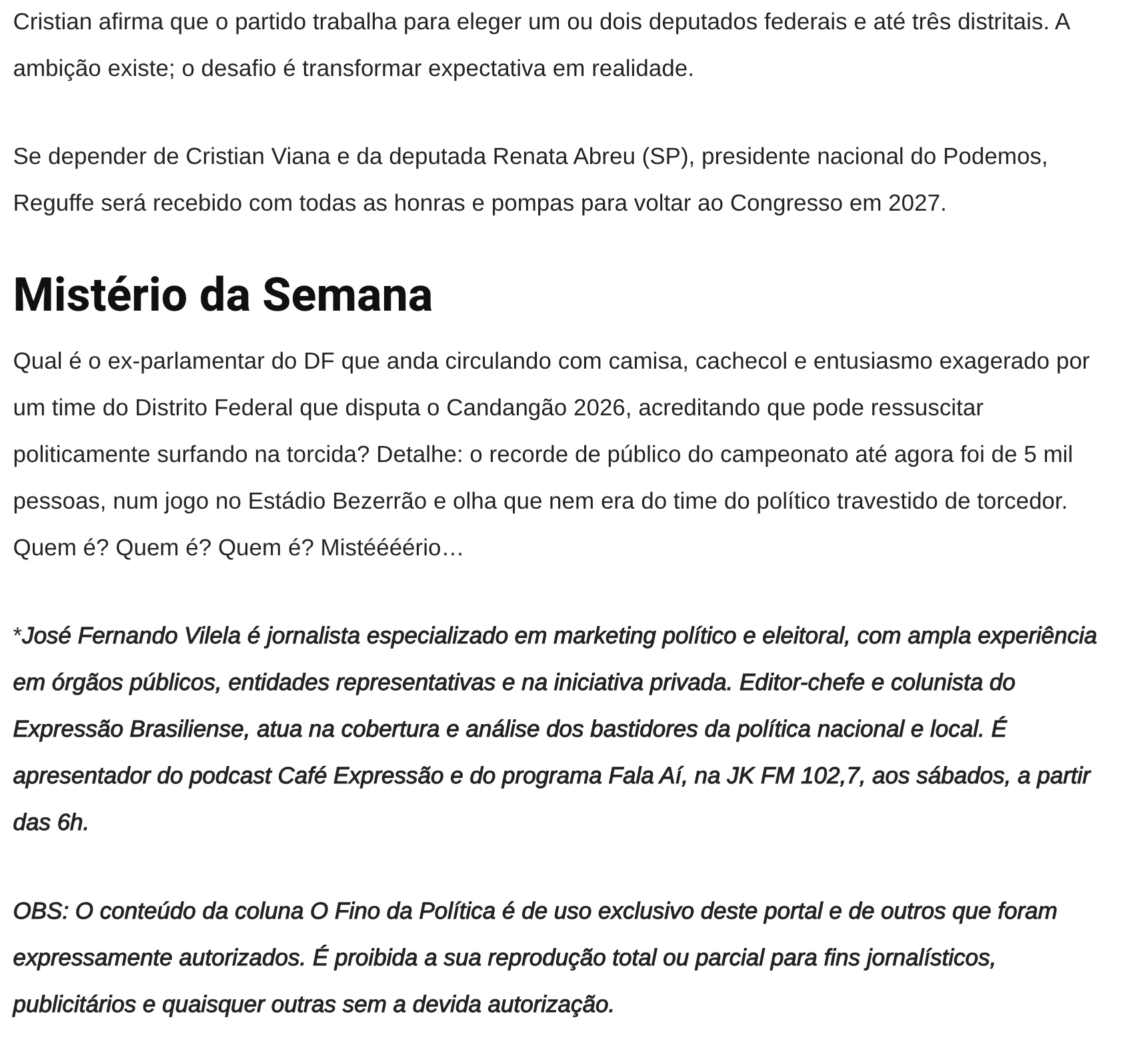 José Fernando Vilella Encontro entre Vorcaro e Lula no Planalto desmonta discurso da esquerda brasiliense 6 de fevereiro de 2026 COMPARTILHAR AGORA FacebookXPinterestWhatsApp Mais emJosé Fernando Vilella Michelle e Bia insistem em chapa puro sangue ao Senado... Cármen Lúcia deve decidir sobre mudança da Lei da Ficha... Articulação de alianças e nominatas vão dominar a pauta do... Kassab e ala do PT nacional articulam chapa Arruda-Grass ao... Bia Kicis vira a casaca, trai Michelle e declara apoio... Prisão de Bolsonaro acirra o clima de disputa eleitoral ... COMPARTILHAR AGORA FacebookXPinterestWhatsApp Últimas Notícias 500 famílias do Arapoanga recebem escrituras de... Iluminação em LED chega a quase 97%... PMDF devolve segurança e autonomia a mulheres... Nova frota: Distrito Federal se prepara para... Zoológico terá entrada gratuita neste sábado somente... Carro da Vacina passa por área rural...