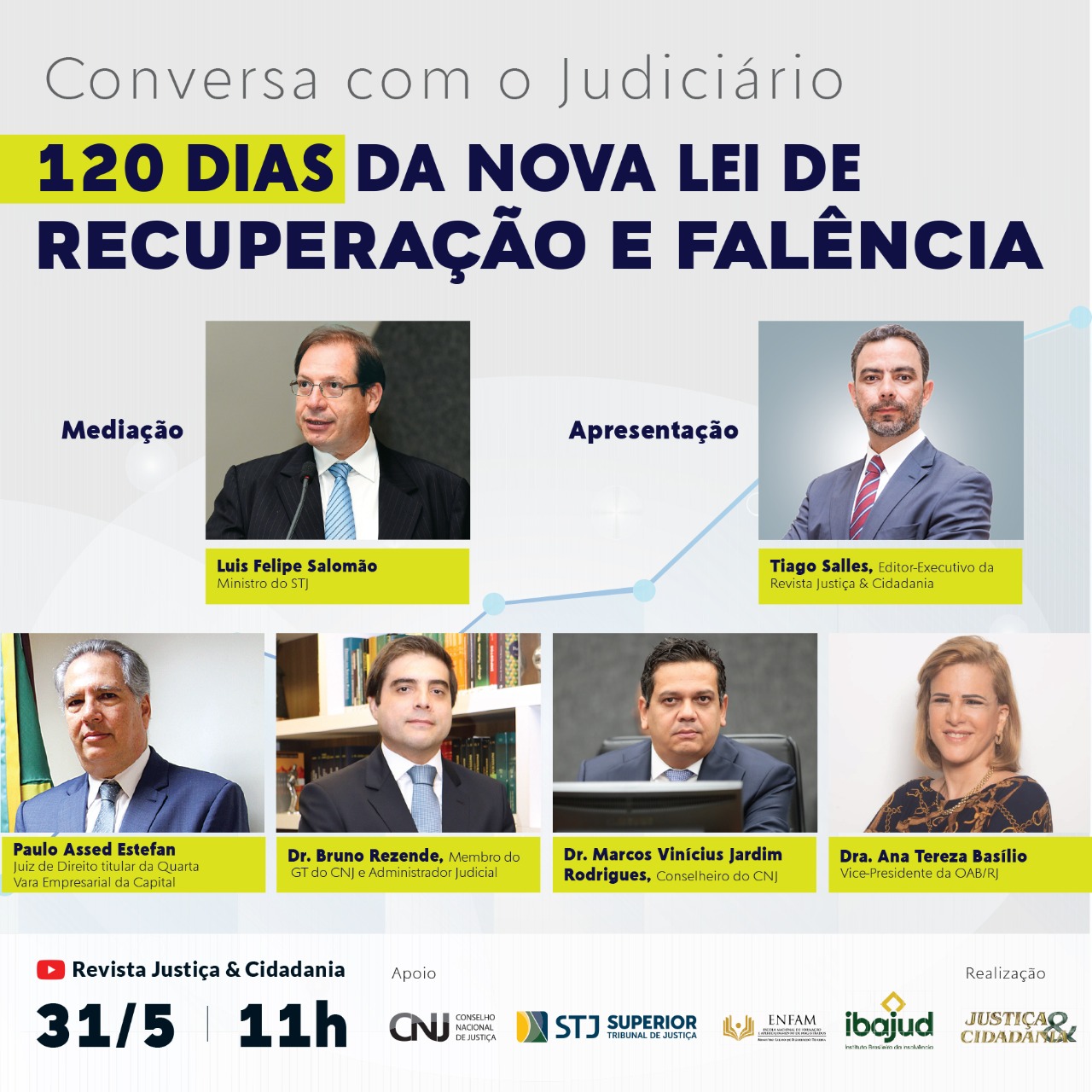 O evento realizado com apoio do CNJ, do STJ, do Instituto Brasileiro de Insolvência (Ibajud) e da Escola Nacional de Formação de Magistrados (Enfam), será transmitido pelo canal de YouTube da Revista Justiça & Cidadania. Posteriormente, o conteúdo será editado em formato de podcast.