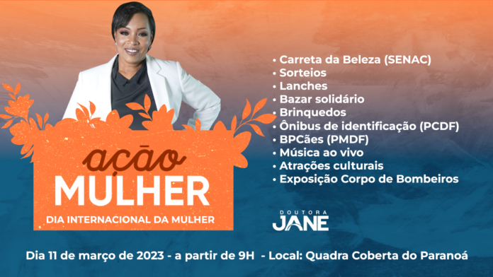 A deputada distrital Doutora Jane realizará uma festa em celebração ao Dia Internacional das Mulheres com serviços, bazar solidário, sorteios, atrações culturais e muita diversão. O evento será no dia 11 de março, a partir de 9h, na Quadra Coberta do Paranoá, e destinado para moradores do Paranoá, Itapoã, Paranoá Parque e toda a região.
