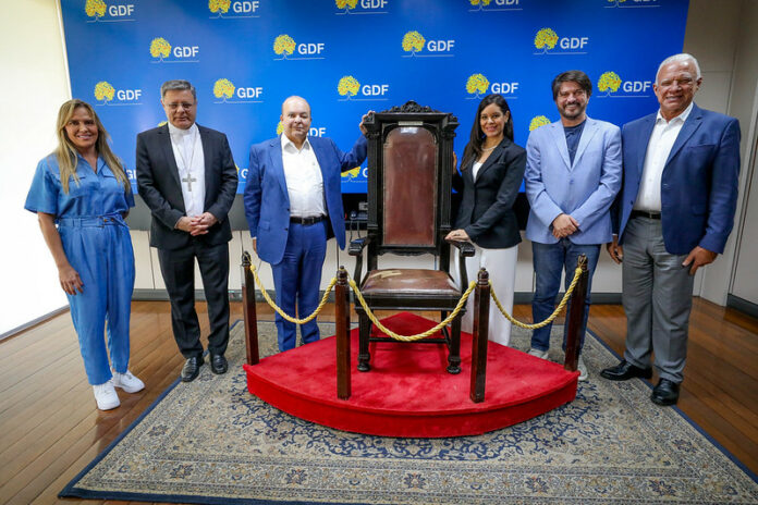 “Essa doação é muito importante para que as pessoas possam visitar a Catedral e ver essa cadeira utilizada pelo papa João Paulo II em sua visita a Brasília”, afirmou o governador Ibaneis Rocha | Foto: Renato Alves/Agência Brasília