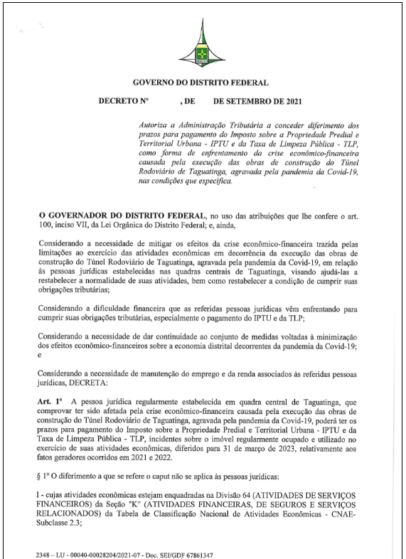 A iniciativa do governador Ibaneis, considera a necessidade de mitigar os efeitos da crise econômica-financeira causadas nas atividades comerciais em decorrência das obras de construção do túnel de Taguatinga, bem como pelos efeitos da pandemia da Covid 19.