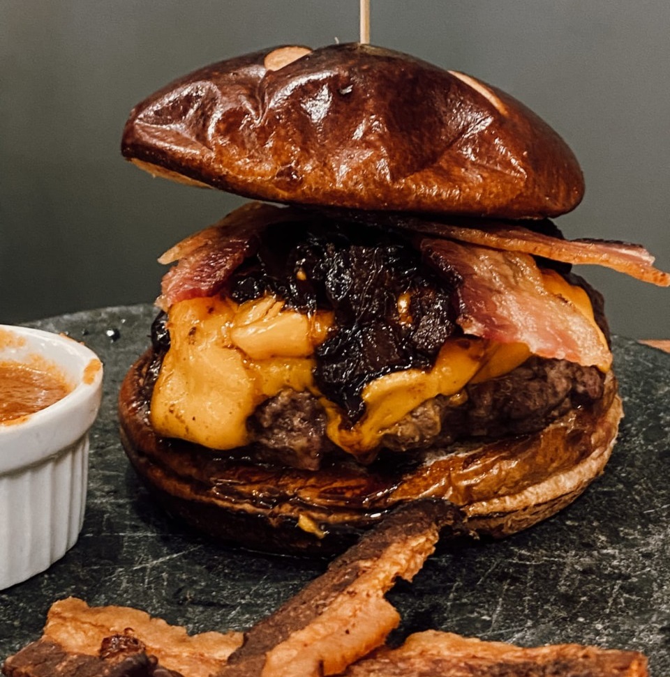 Hambúrguer artesanal na parrilla e molhos de cervejas artesanais, no Assados do Fred