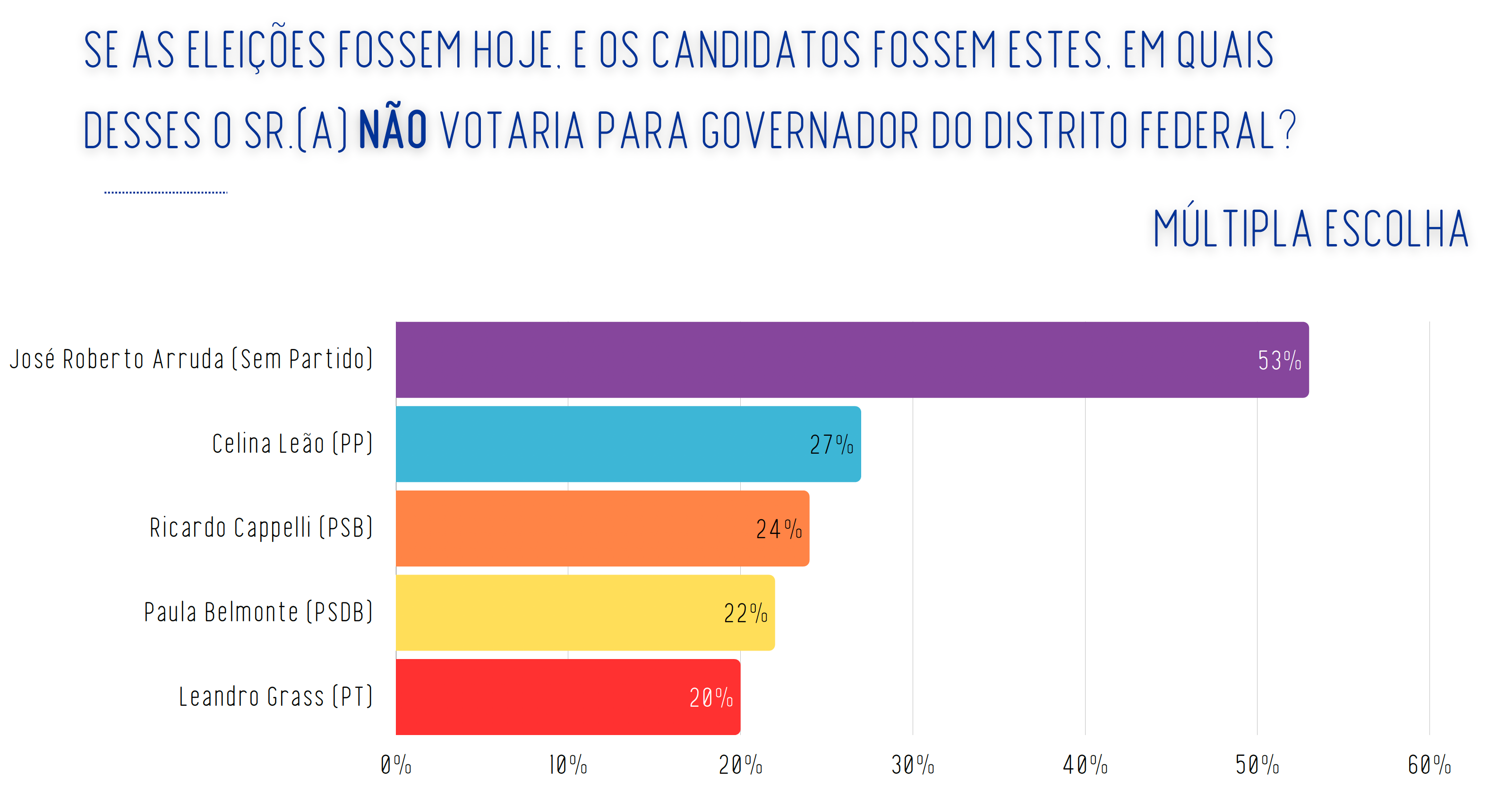 Arruda, condenado por corrupção e improbidade administrativa na Operação Caixa de Pandora, deflagrada em 2009, que resultou em sua cassação em 2010 e prisão no mesmo ano, supera outros candidatos na lista de rejeição. Celina Leão (PP) registra 27%, Ricardo Cappelli (PSB) 24%, Paula Belmonte (PSDB) 22% e Leandro Grass (PV) 20%.