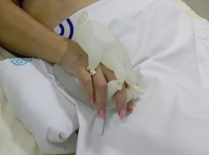 A técnica consiste em usar luvas cirúrgicas cheias de água morna para transmitir a sensação de calor humano. Thaís Ribeiro, gerente de Enfermagem, explica como funciona: “Enchemos duas luvas com água morna. Colocamos uma das mãos da pessoa entre as duas luvas. Ele passa a ter a sessão de que alguém está segurando sua mão. Essa sensação produz conforto psicológico, ajudando a acalmar pessoa”.
