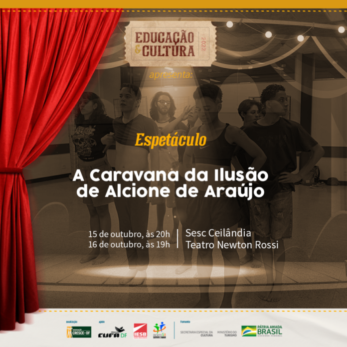 O espetáculo teatral Caravana da Ilusão, inspirado no texto de Alcione Araújo, e construído por professores e alunos do projeto de formação Educação e Cultura, tem duas apresentações no Sesc Ceilândia: 15/10 às 20h e 16h às 19h. A entrada é gratuita, mediante doação de 1kg de alimento e retirada de ingresso pelo site sympla.