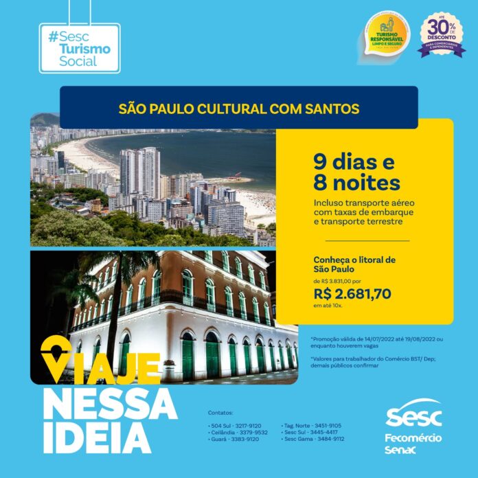 Atualmente são três pacotes disponíveis com desconto de 30%. De 17 a 25 de agosto, a viagem será para Santos, em São Paulo. A proposta é conhecer uma variedade de cenários, riquezas culturais, históricas e ecológicas da cidade. Os pacotes variam a partir de R$ 2.621,50.